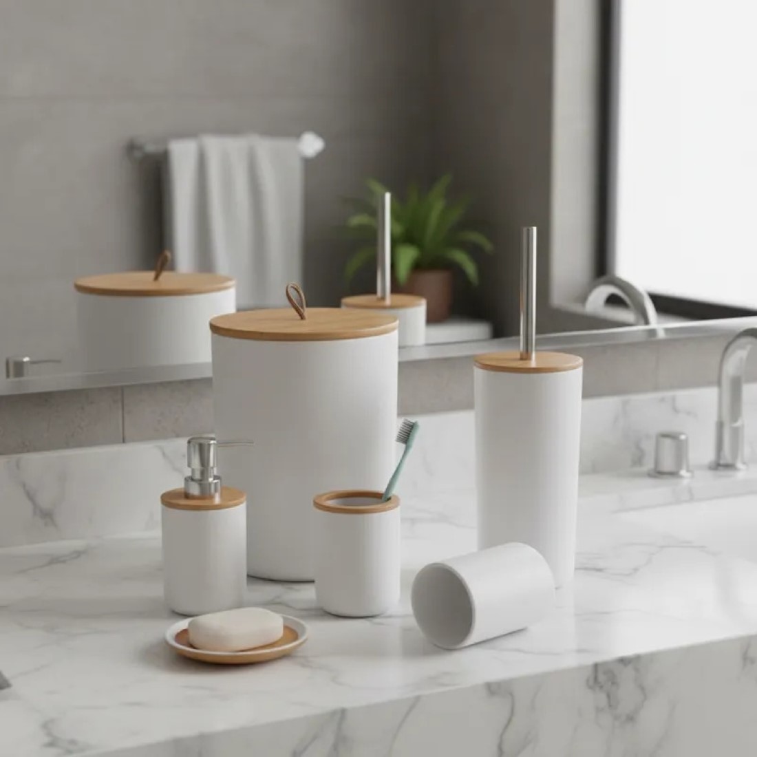 Transforme seu banheiro em um espaço elegante e funcional com o Kit Banheiro Com Tampa De Bambu Com 6 Peças da marca Flashgoods. Este conjunto é ideal para quem busca praticidade e estilo, combinando a resistência do plástico PP com a beleza natural do bambu.
