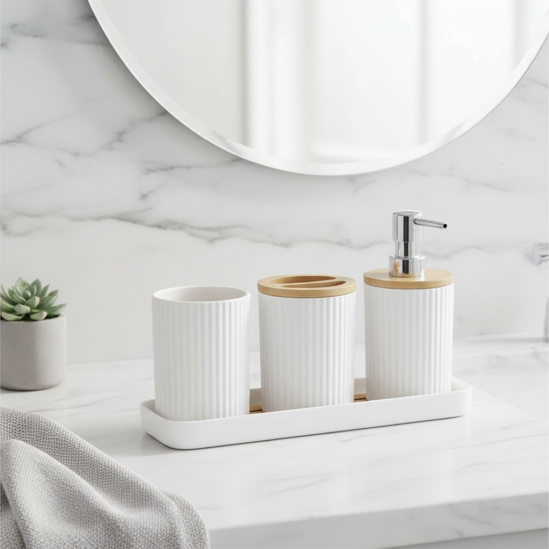 Renove seu banheiro com elegância e praticidade usando nosso Kit de Banheiro Moderno! Com 4 peças que unem o charme natural do bambu ao design contemporâneo, esse conjunto transforma a rotina diária em um momento de sofisticação e bem-estar.