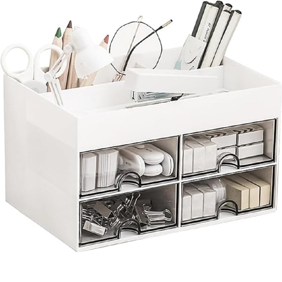 Um organizador de mesa com quatro gavetas é um item prático e versátil projetado para manter a sua área de trabalho arrumada e eficiente. Cada gaveta é projetada para armazenar itens pequenos e variados, como canetas, clipes de papel, post-its, cartões de visita e outros acessórios de escritório, Além de manter a área de trabalho limpa e arrumada, o organizador ajuda a melhorar a eficiência ao garantir que todos os itens necessários estejam ao alcance das mãos.