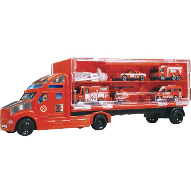 Linda mini carreta que permite guardar mais 6 carrinhos além dos que acompanha o kit que são furgões, helicóptero, carrinho e placas de sinalização. Perfeita para completar a cena de resgate da brincadeira da criançada.