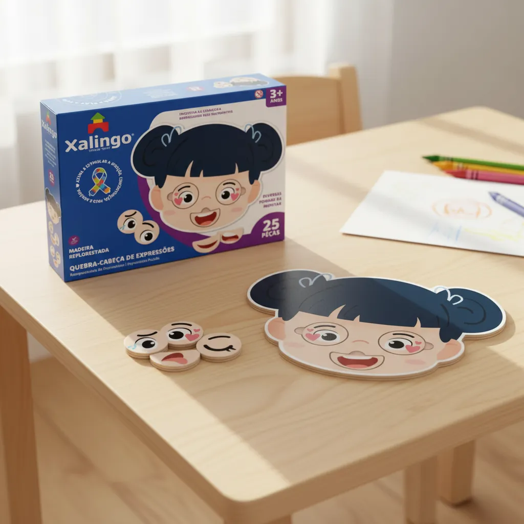 Um quebra cabeça de encaixe que incentiva as crianças a expressarem seus sentimentos de forma divertida. Desenvolve o raciocínio logico e a coordenação motora fina de forma lúcida. São 25 peças para formar diversas expressões e sentimentos.